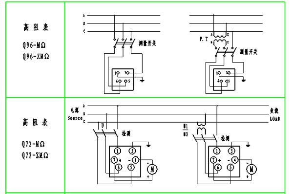 高阻表測量范圍額定電壓0-5MΩ100V、127V ﹑220V、380V、400V、440V380V(經380/100V或380/127V.P.T接入) 接線圖: |